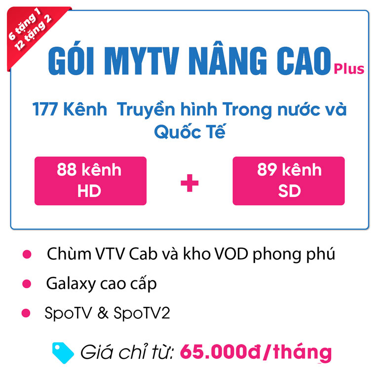 Truyền hình MyTV Nâng Cao là gói gồm 177 kênh truyền hình SD&HD (bao gồm 22 kênh VTVcab). Khi đăng ký gói Nâng Cao người dùng sẽ được TẶNG 01-02 THÁNG sử dụng